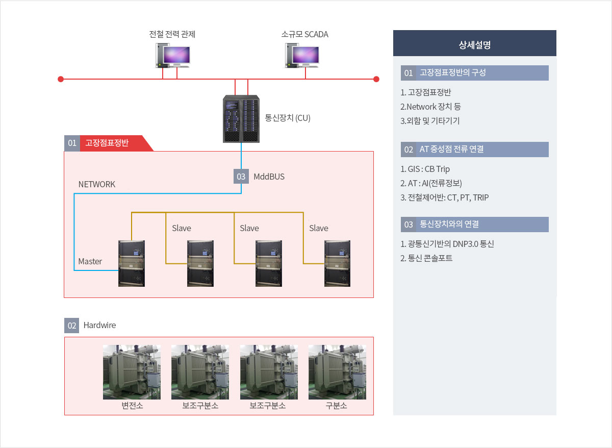 변전소에서 구분소간 전차선로에 전기를 공급하여 운영중 지락사고 또는 전차선 단전 등 사고시 사고지점을 표정하여 운영자 및 유지보수자에게 알려주는 중요설비입니다. 고장위치를 최단시간에 알려줌으로써 긴급복구시 시간을 절약할 수 있는 시스템입니다.